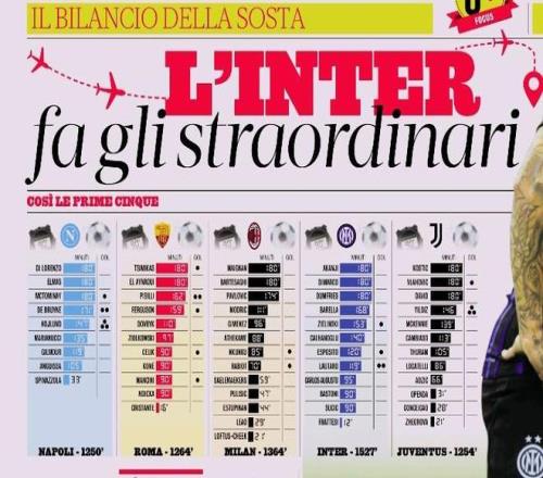 但仔细看下来,国米的国脚数量还不是最多的,跟尤文一样是12名,AC米兰最多是13名,罗马11名,那不勒斯9名。不过在人均出场时间上,国米就只能排在次席了,榜首变成了那不勒斯,他们的国脚平均出场时间为138.9分钟,国米是127.25分钟,之后一次是罗马114.9分钟、AC米兰104.92分钟和尤文104.5分钟。综合来看,国米球员在国际比赛日的比赛消耗基本是最大的,毕竟国脚人数多,比赛总时间和人均时间也都很长。