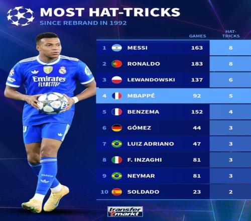 欧冠92年改制后戴帽数前10:梅西、C罗8次第1,姆巴佩5次第4